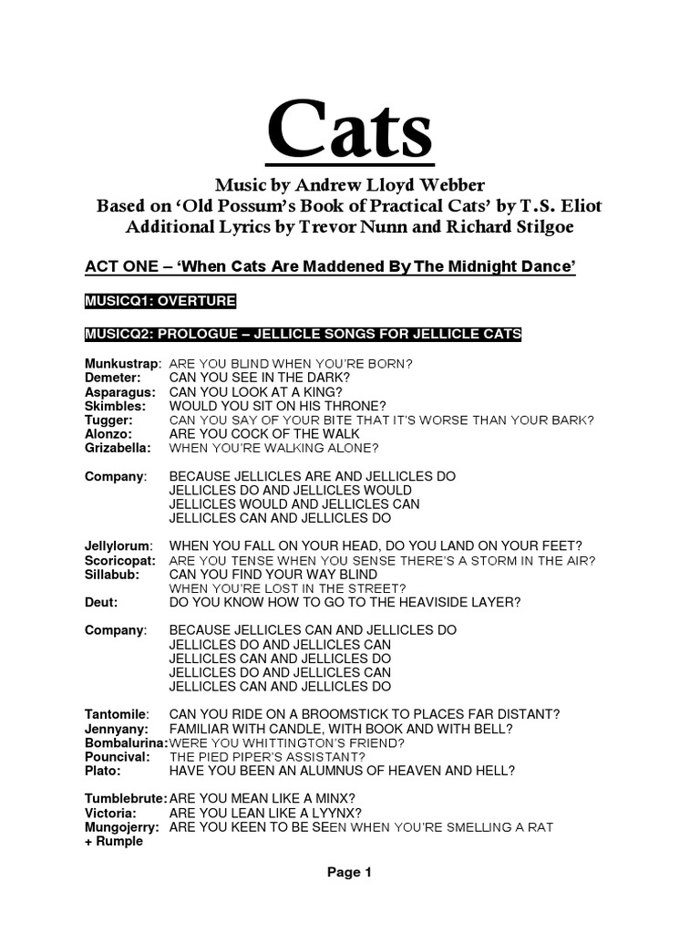 Cats Overture Lyrics - Tonight is the one special night each year when the tribe of jellicle cats reunites to celebrate who they are. Cats Overture Lyrics - Not a sound from the pavement.